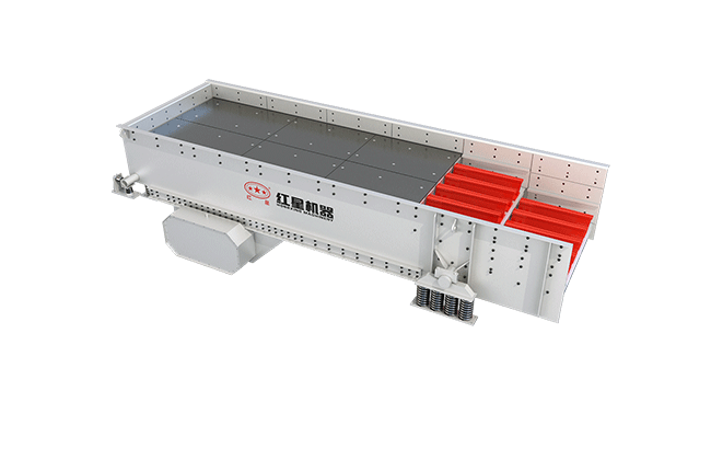 振動給料機主要由機身、彈簧、彈簧底座、激振器、振動電機、篩條組成。電動機經三角帶使激振器偏心塊產生高速旋轉;運轉的偏心塊產生很大的離心力,激發篩箱產生一定振幅的圓運動,篩上物料在傾斜的篩面上受到篩箱傳給的沖量而產生連續的拋擲運動,物料與篩面相遇的過程中使小于篩孔的顆粒透篩,從而實現分級。