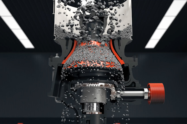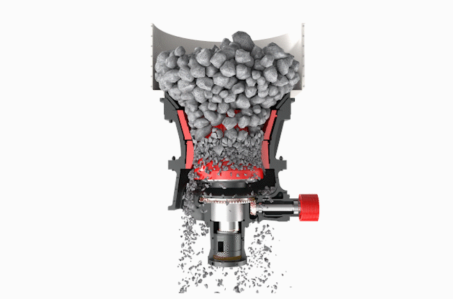 單缸圓錐破碎機工作時,電機帶動破碎機的小齒輪,小齒輪帶動大齒輪,大齒輪組件帶動偏心套組件和主軸組件以理論垂直線為中心,在銅襯套內公轉,主軸組件在偏心銅套內以主軸的中心線可以實現自轉。當物料加入到破碎腔后,主軸總成在物料的阻力下在偏心銅套內緩慢的自轉。內錐的運行軌跡看起來是在破碎腔內來回擺動,同時緩慢的旋轉。物料被擺動的內錐擠壓破碎,破碎出的物料從而排料口排出。