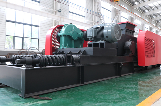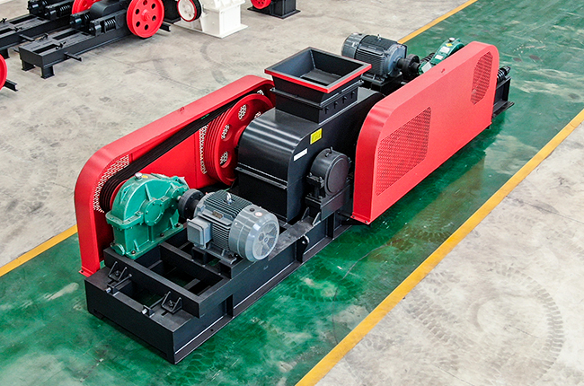 對輥破采用兩組單獨(dú)傳動(dòng)的輥?zhàn)樱瑔?dòng)破碎機(jī)后,兩輥輪作相向旋轉(zhuǎn),形成“V”型破碎腔,物料從料斗定量給入破碎機(jī),切向進(jìn)入兩輥中間,由于輥輪調(diào)整的中間縫隙較小,且系統(tǒng)強(qiáng)度遠(yuǎn)大于物料(不會(huì)因?yàn)槲锪嫌捕雀叨馆佪嗛g距變大或改變輥路運(yùn)動(dòng)狀態(tài)),擠在兩輥中間的物料會(huì)隨著對輥的旋轉(zhuǎn),被壓力擠碎成很小的粒度,然后隨著輥輪的旋轉(zhuǎn)方向進(jìn)入機(jī)器的底部,從有斜度的料槽流出機(jī)器,完成整個(gè)破碎過程。