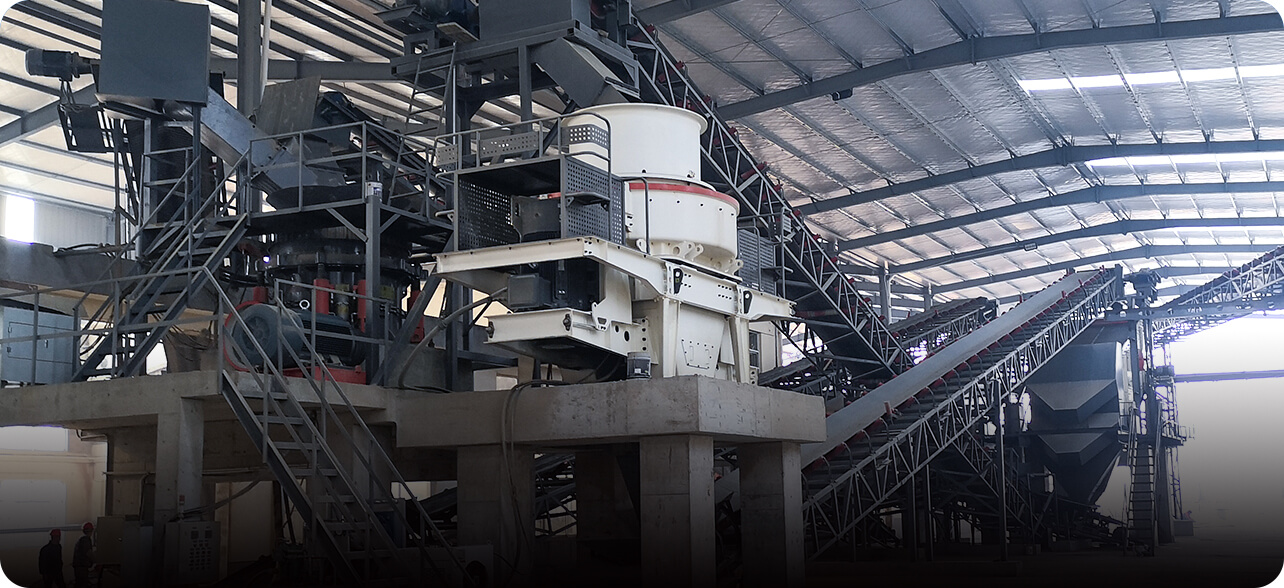 原料由料倉進入振動給料機,再送入顎式破碎機進行粗碎,粗碎后物料經輸送機進入反擊破或圓錐破進行細碎,細碎后物料由輸送機送至振動篩進行篩選,不滿足制砂機進料粒度的被返回反擊破或圓錐破中繼續破碎,滿足進料粒度的物料被送入制砂機內進行制沙。從制砂機出來的細料,再次進入振動篩內進行篩分,篩分出滿足要求的砂子,進入洗砂機清洗,清洗后由成品輸送帶輸送至成品堆;不滿足要求的砂石混合物料,送入制砂機進行再次破碎。